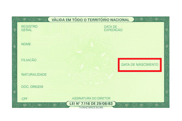 Na Cédula de Identidade brasileira, a data de nascimento está localizada no canto direito do verso do RG, assim como as demais informações básicas sobre o cidadão.
